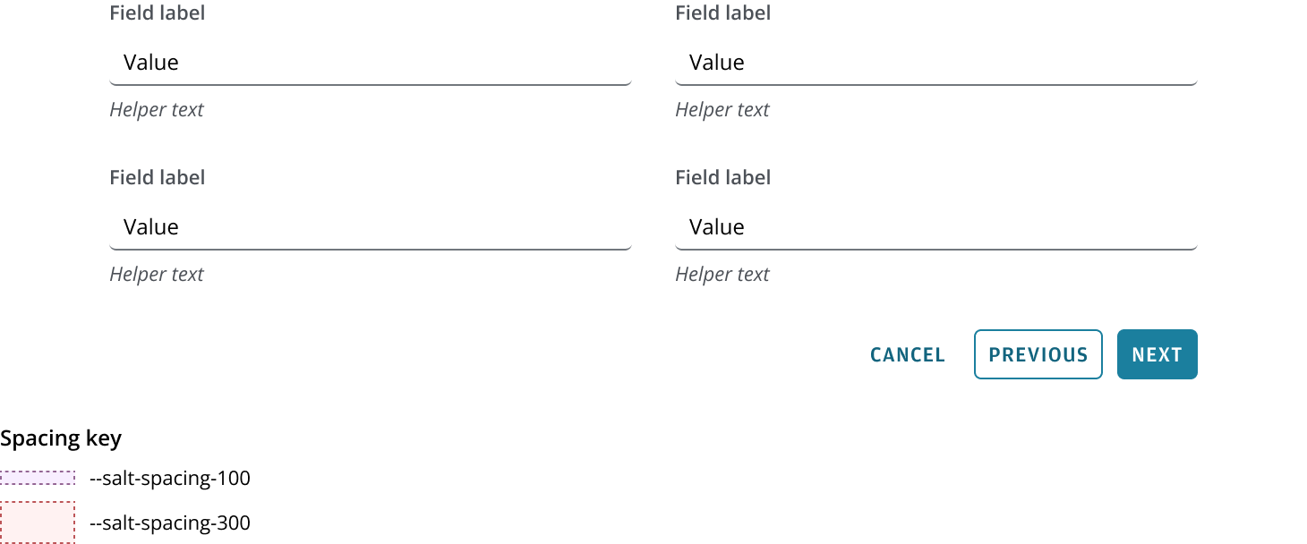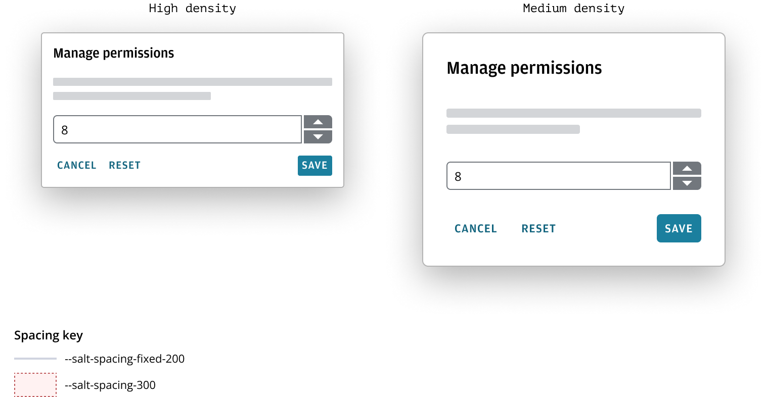 Salt’s spacing system uses a base unit, --salt-spacing-100, which scales proportionally across all desktop densities (high, medium and low densities). Each spacing token is a multiple or percentage of this base unit, ensuring predictable and flexible spacing.