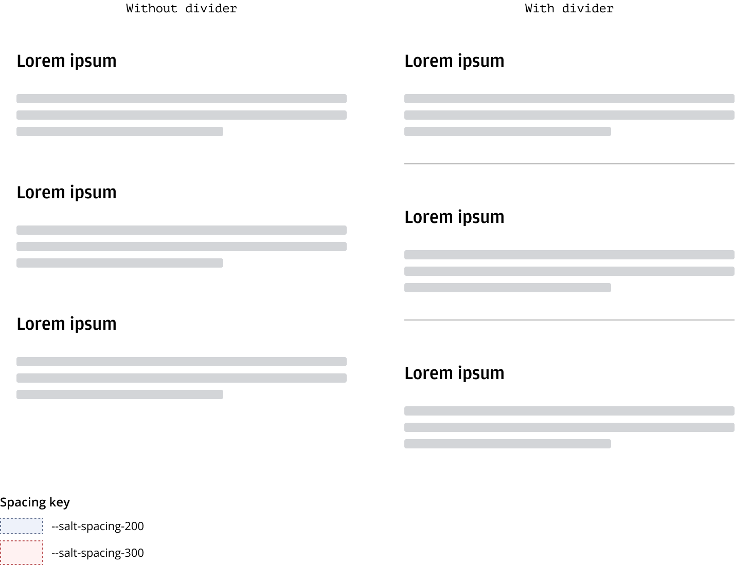 Horizontal dividers help segment layout regions and should be consistently spaced on the page. For more details on dividers, please refer to Divider.